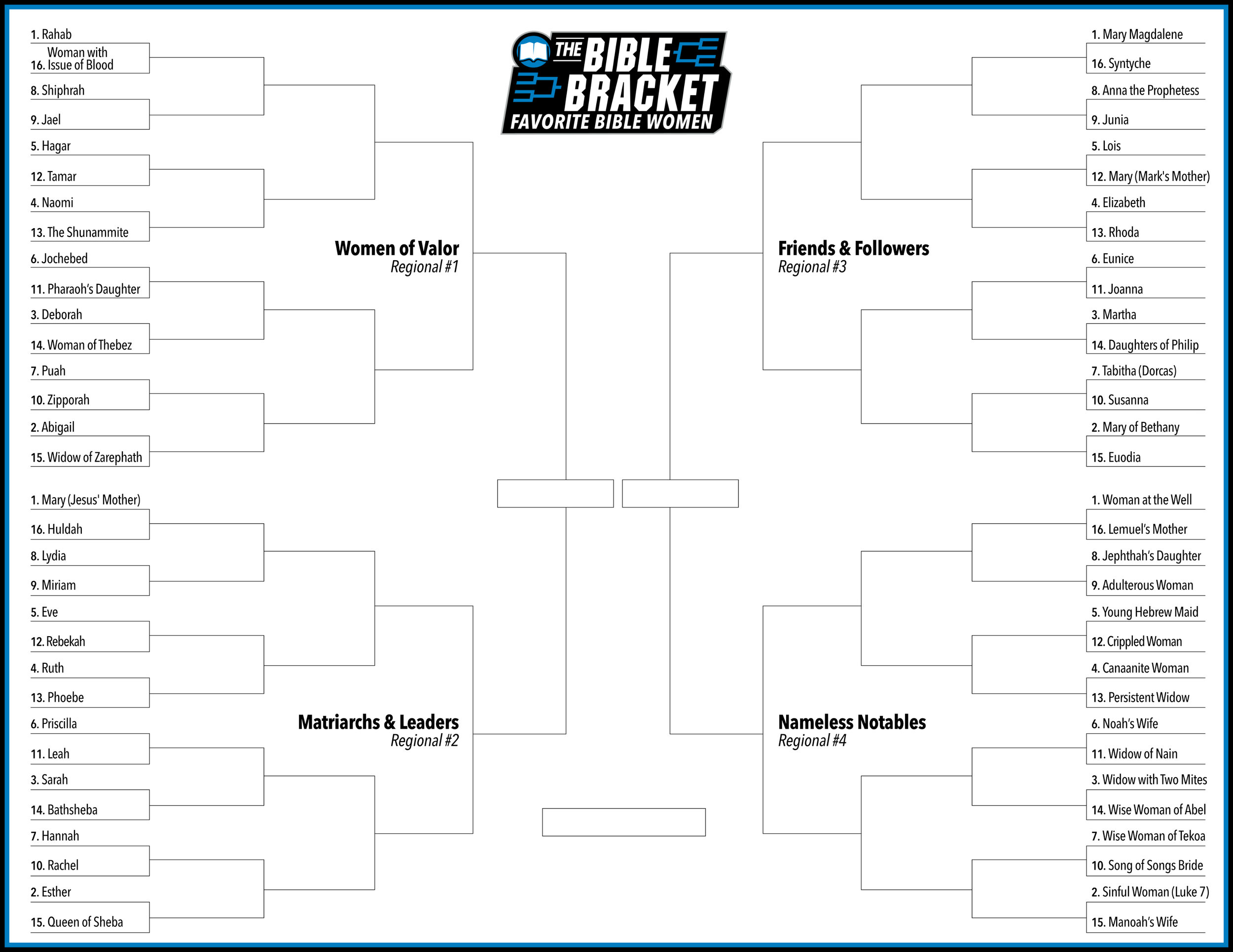 Round 1 Voting Open Through March 18th, 2026 View fullsize Download the Blank Bracket How’d we pick the 2026 matchups? Check out our podcast episodes where drafted our Favorite Bible Women. Featured Past Bible Brackets View fullsize 2025 — Favorite Bible Verses Download the Blank Bracket View fullsize 2024 — Favorite Bible Stories Download the Blank Bracket View fullsize 2023 — Favorite Figures of Faith Download the Blank Bracket View fullsize 2020 — Favorite Bible Chapters Download the Blank Bracket